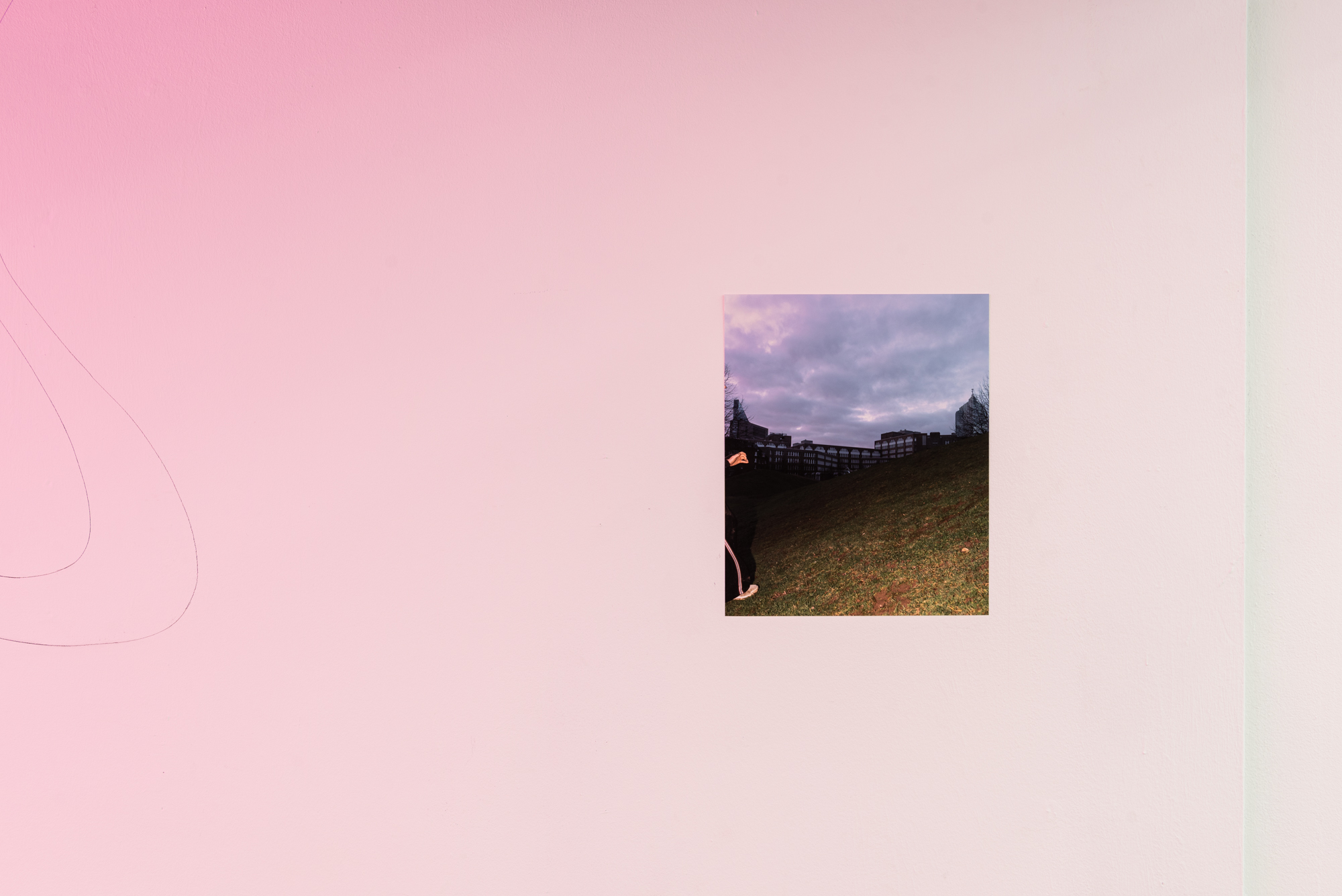 'In the underground passage of a subway station in Düsseldorf, the foundations and roots of the above are revealed: Commerce made of glass, pace in neon light, rubber-tiles, abrasion. Slowly, an aggregate clocks the access to the installation, marks and claims sole sovereignty over the space that the bamboo-wing circumscribes. What usually weighs gently and passively in the wind receives a fierce emphasis in the horizontally motorized movement. An artificial pink provides the leaves with light, promising growth even if though all water has already dried up. Its viscous residues stick under the soles of our shoes as if to hold us in place: dirty veins show a fragmentary sketch. A cardboard structure claims a part of the unsecured terrain and rocks sensitively to the rhythm of the leafy greetings.
